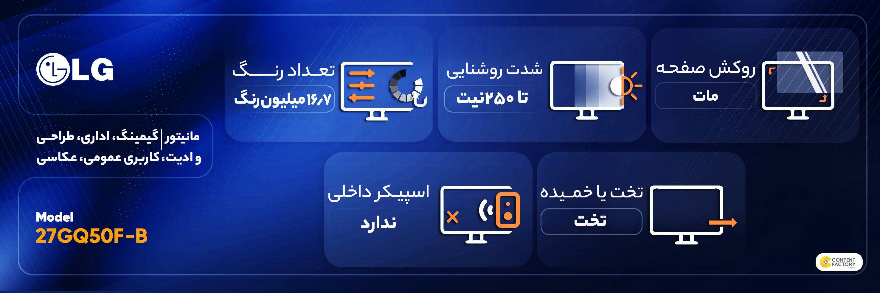 مانیتور گیمینگ ال جی مدل 27GQ50F-B با سایز 27 اینچ، یک گزینه برجسته در دسته مانیتورهای بازی با کارایی بالا و ویژگیهای منحصربهفرد محسوب میشود. در این بخش، به طور دقیق به مشخصات و ویژگیهای این مانیتور ازجمله کیفیت تصویر، نرخ تازهسازی و زمان پاسخدهی، تکنولوژیهای تصویری، درگاهها و اتصالات، طراحی و ویژگیهای ظاهری میپردازیم.