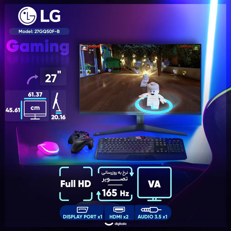 مانیتور گیمینگ ال جی مدل 27GQ50F-B با سایز 27 اینچ، یک گزینه برجسته در دسته مانیتورهای بازی با کارایی بالا و ویژگیهای منحصربهفرد محسوب میشود. در این بخش، به طور دقیق به مشخصات و ویژگیهای این مانیتور ازجمله کیفیت تصویر، نرخ تازهسازی و زمان پاسخدهی، تکنولوژیهای تصویری، درگاهها و اتصالات، طراحی و ویژگیهای ظاهری میپردازیم.