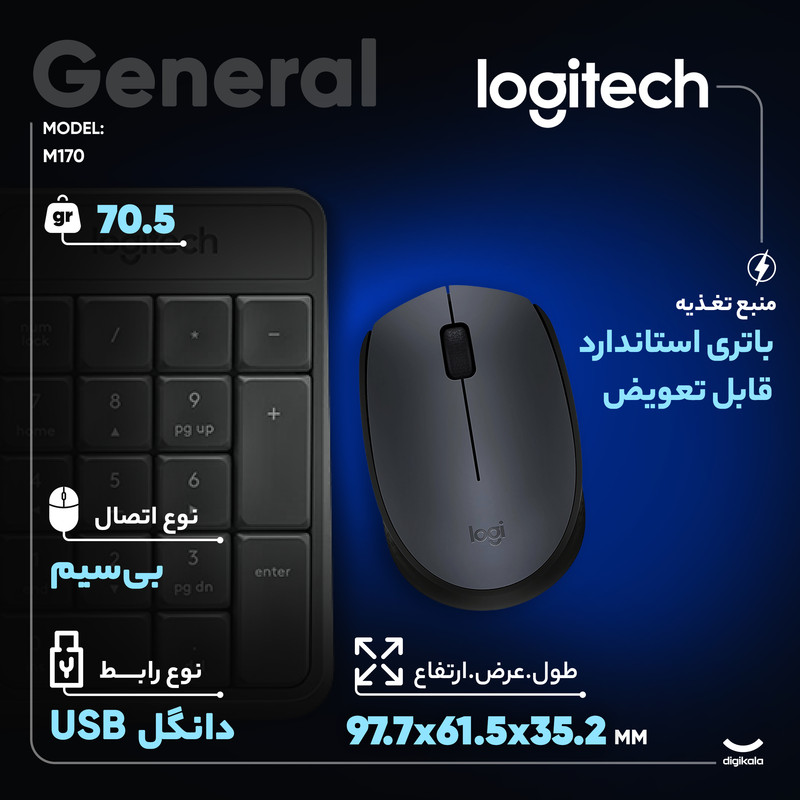 ماوس لاجیتک مدل M170 دارای سه کلید اصلی در قسمت بالایی و یک کلید برای خاموش یا روشنکردن در قسمت پشتی است. سه کلید اصلی در این محصول مانند تمام ماوسهای میانرده شامل کلید راستکلیک، چپکلیک و اسکرول است. هنگام استفاده از کلید اسکرول شاید رواننبودن آن کمی برایتان ناخوشایند باشد؛ ولی هنگامیکه بخواهید از این ماوس در محیطهای گرافیکی، مرورگر وب و… استفاده کنید، به حرفهایبودن آن و علت این نوع طراحی شرکت لاجیتک پی خواهید برد. ماوس M170 از طریق دانگل USB به رایانهی شما متصل میشود و بدون نیاز به نصب هیچگونه نرمافزاری، قابلاستفاده خواهد بود. ماوس M170 با تمام سیستمعاملهای رایج ازجمله نسخههای مختلف سیستمعامل ویندوز سازگار است. به یاری پشتیبانی از فرکانس ۲٫۴گیگاهرتزی میتوان از ماوس لاجیتک مدل M170 تا فاصلهی ۱۰متری از رایانه استفاده کرد. البته باید به این نکته اشاره شود که محدودهی عملکرد گفتهشده تنها در محیطهای وسیع و بدون وجود جداکنندههایی مانند دیوار است. ماوس M170 انرژی خود را از یک باتری قلمی سایز AA تأمین میکند که به یاری آن میتوان تا ۱۲ ماه از ماوس استفاده کرد. البته در قسمت پشتی ماوس یک کلید خاموش/روشن تعبیه شده است که میتوان هنگام استفادهنکردن از M170 آن را خاموش کرد. اگر پس از بازکردن جعبهی محصول دانگل USB آن را پیدا نکردید، نگران نباشید؛ شرکت لاجیتک برای این دانگل کوچک و کمکردن احتمال گمشدن آن، جایگاهی در کنار باتری در نظر گرفته است.
