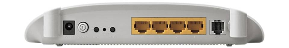 اگر به قسمت پشت این محصول نگاه کنید، یک آنتن از سمت راست میبینید که در کنار آن یک پورت خاکستریرنگ قرار دارد. این پورت خاکستری RJ-11 نام دارد و برای اتصال کابل تلفن استفاده میشود. در کنار پورت RJ-11 میتوانید، 4 پورت زرد رنگ شبکه (LAN) را بیابید که برای اتصال بهصورت باسیم و از طریق کابل شبکه به کار میروند. از 4 پورت شبکه که بگذرید، با کمی فاصله میتوانید یک کلید کوچک مشکیرنگ را ببینید که در زیر آن عبارت Wi-Fi حک شده است و همانطورکه از نامش پیداست، برای قطع و وصل کردن شبکهی بیسیم (Wi-Fi) به کار میرود. بعد از کلید Wi-Fi یک شیار بسیار ریز قرار دارد که در زیر آن عبارت Reset حک شده است و شما میتوانید با نگهداشتن آن به مدت چند ثانیه، تنظیمات دستگاه را ریست کرده و به حالت اولیه بازگردانید. در کنار شیار ریست، یک کلید مشکیرنگ دیگر درست مانند Wi-Fi قرار دارد که در زیر آن عبارت WPS نوشته شده است. دربارهی WPS در قسمت پایین توضیح خواهیم داد.