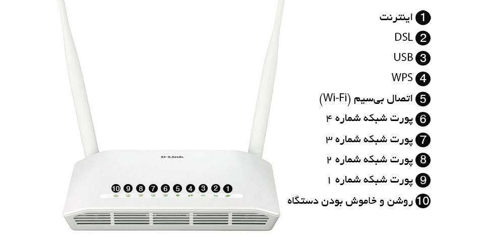در قسمت جلویی این مودم-روتر، یک قسمت پنجرهایشکل قرار دارد که برای خنکشدن دستگاه و زیبایی بیشتر در آنجا تعبیه شده است. میتوانید در قسمت بالای این قسمت پنجرهایشکل، تعدادی LED را ببینید که هرکدام به منظوری طراحی شدهاند. از قسمت روبهرو که به این محصول نگاه کنید، از سمت چپ اولین LED مربوط به پاور (Power) است و برای نمایش اتصال صحیح آداپتور برق به دستگاه و روشن و خاموشبودن آن به کار میرود. در کنار LED پاور 4 عدد LED با اعداد 1 تا 4 قرار گرفتهاند که نمایانگر 4 پورت شبکهی محصول هستند. اگر از پورتهای شبکه استفاده کنید، بسته به اینکه از کدام یک از آنها استفاده کرده باشید، چراغش روشن میشود و به شما نشان میدهد که از کدام یک از آنها استفاده کردهاید و این پورتها درحالحاضر فعال هستند یا فعال نیستند. بعد از LEDهای شبکه LED اتصال بیسیم (Wi-Fi) قرار دارد که برای نمایش فعالبودن اتصال بیسیم به کار میرود. در کنار این LED میتوانید LED مربوط به WPS را بیابید که به شما روشن یا خاموشبودن WPS را نشان میدهد. بعد از کمی فاصله LED مربوط به رابط USB را میبینید که وقتی یک دستگاه را به پورت USB متصل کنید، روشن میشود. نشانگر LED بعدی مربوط به DSL است و هنگامی که از حالت چشمکزن به حالت ثابت دربیاید، یعنی سرویس ADSL به خط تلفنی که مودم-روتر به آن متصل بوده، وصل شده است. اما آخرین LED برای نمایش اتصال اینترنت است. اگر مودم شما به اینترنت متصل شده باشد، این LED به رنگ سبز درمیآید؛ در غیر این صورت این LED به رنگ قرمز میماند و به شما نشان میدهد که دستگاه شما هنوز به اینترنت متصل نشده است.