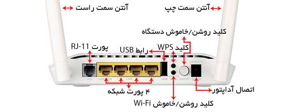 نوبت به چهار پورت زردرنگ شبکه میرسد که برای اتصال دستگاههای مختلف بهصورت باسیم به مودم-روتر کاربرد دارند؛ بنابراین شما میتوانید تا چهار دستگاه را بهصورت کابلی یا باسیم به این مودم-روتر متصل کنید. در کنار چهار پورت شبکه، آخرین پورت این محصول (از سمت راست) دیده میشود که یک پورت خاکستریرنگ بوده و در قسمت زیر آن عبارت DSL نوشته شده که پورت RJ-11 یا همان پورت اتصال خط تلفن است. در کنار پورت RJ-11 یعنی در آخرین قسمت سمت چپ این محصول (اگر از پشت به آن نگاه کنید)، آنتن 5 دسیبلی سمت راست مودم-روتر قرار گرفته است.