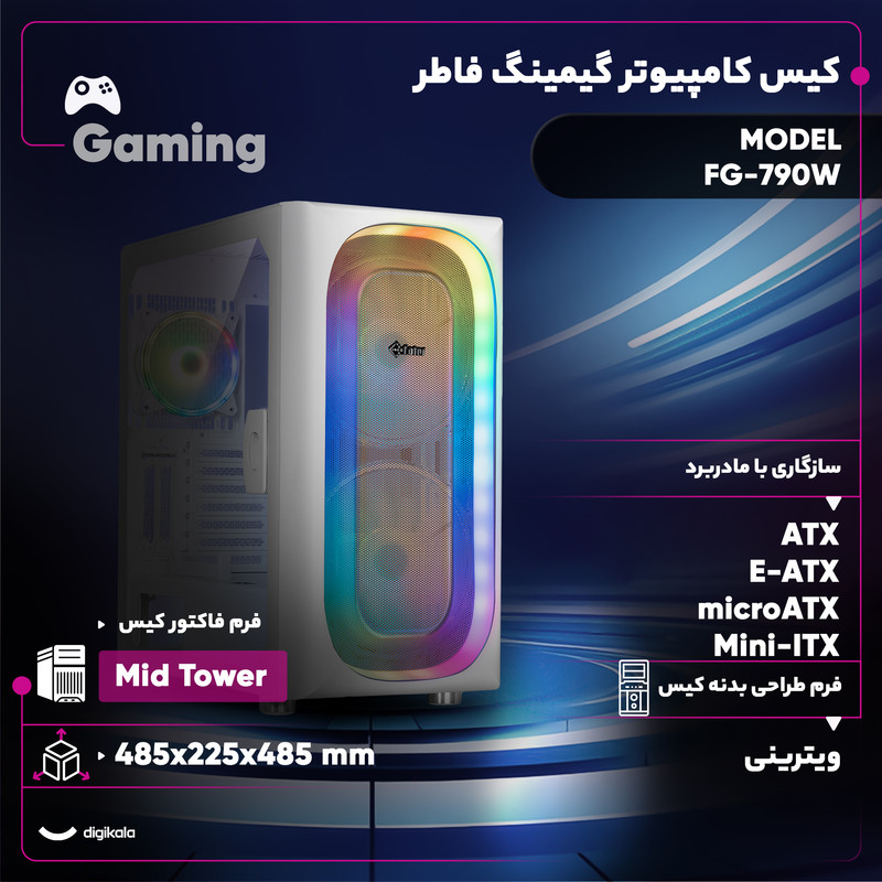 کیس حرفه ای 790 فاطر یکی از بهترین و کاملترین کیسهای بالا رده تولید شده توسط برند فاطر میباشد که پیشتر به رنگ مشکی موجود بود اما با توجه به تقاضای های مکرر از سوی مشتریان فاطر هم اکنون به رنگ سفید نیز موجود شده است. طراحی دقیق محل قرار گیری قطعات، مهندسی سیستم همرفت هوایی و محل های نصب فن های مختلف سیستم، پشتیبانی از سیستم های خنک کننده مایع 360، وجود فیلتر های ورود و خروج هوای قابل شستشو و آهن ربایی، پورت های کافی در پنل جلو، جنس آلیاز سبک و ضد تشعشع و دافع نویز، تعداد مناسب جایگاه پذیرش درآور های 2.5 و 3.5 اینچی و سازگاری با انواع مادر برد های ATX، ITX و M-ATX و حتی E-ATX این سری را به یک انتخاب ویژه برای گیمر ها تبدیل نموده است. در زمینهی طراحی هم فاطر به استفاده از شیشههای حرارت دیده برای یک طرف کیس و نورپردازیهای متنوع ARGB هم چشم پوشی نکرده است. درب شیشه ای کنار کیس جهت نمایان بودن قطعات داخلی آن به شکلی طراحی شده که به کمک لولا و دستگیره آسان باز شو همانند یک درب کامل باز و بسته شود. پایههای مخصوص ضد لرزش نهتنها صدای محیطی کیس را کاهش میدهد بلکه باعث جریان هوای عالی در زیر کیس هم میشود. همچنین در محل های ورود خروج هوا فیلتر های توری اهنربایی با قابلیت شستشو قرار داده شده است که براحتی قابل تمیز کردن و هوا دهی مناسب باشد.گرچه بر روی پنل جلویی این کیس به صورت پیش فرض دو فن قدرتمند 200 میلیمتری از نوع ARGB نصب شده است اما قابلیت تعویض آن ها با 3 عدد فن120 یا 140 میلیمتری نیز وجود دارد. این سری کیس ها دارای 2 جایگاه 3.5 اینچی ایزی ستاپ و 2 جایگاه 2.5 اینچی برای پذیرش انواع هارد دیسک های مکانیکی، هیبریدی و SSD میباشند و همچنین از اسلات عمودی برای کارت گرافیک نیز پشتیبانی میکند. طراحی سینی این کیس به گونه ای میباشد که بتوان کابلها و سیمهای درون کیس را در پشت سینی مدیریت و مخفی نمود. همچنین طراحی خاص رک هارد دیسک به شکلی است که نیاز به نصب توسط پیچ و مهره نباشد. لازم به ذکر است فضایی برای نصب خنک کننده مایع در یالا و یا پشت کیس نیز طراحی و در نظر گرفته شده است.